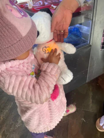– Ouvrez la petite fermeture éclair au dos de la peluche et retirez délicatement le boîtier à piles.